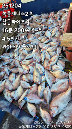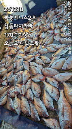 2025.12.10녹동제니스3호 참돔타이라바 조황 ....기상좋은 수요일 14분 조황입니다 오늘은 딱 두포인트에서 끝났네요먹이사냥하는 엄청난 활성도와 좋은 어군속에서 낚시할수있었습니다평일임에도 선단3척이 모두 출항했고,많은 관심에 감사말씀 드립니다3척모두 세자릿수 넘기며 호조황으로 입항합니다오늘도 15시 이후로는 물때가 끝나 고름안짜고 15시칼퇴합니다한판때기 넘기며 총180수 넘기고 입항하였습니다 오늘도 고생많으셨고 찾아주셔서 감사합니다 ..먼바다 기상이 오늘이후로 좋지못하네요다음 타이라바출항은 공지하도록 하겠습니다 *** 녹동 제니스3호 예약 안내 ***예약문의 : 010-8652-3919오시는길 : 전남 고흥군 도양읍 봉암리 3950 (녹동항)홈페이지 : http://zenith.sunsang24.com/