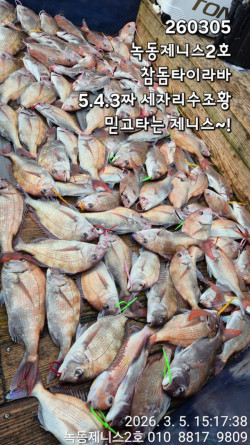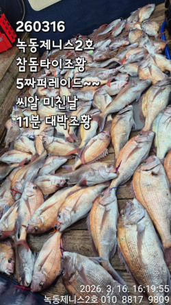 #참돔타이라바 #녹동제니스2호 #제니스2호 #저수지260311/참돔타이라바/제니스2호/저수지오늘도 참돔타이라바 다녀왔습니다!오늘도 짱선장 입니다!수온 찾아 고기 찾아 열심히 돌아봤습니다약한 조류에 바람까지 없으니 완전 저수지 같은하루라3.4.5짜 섞여서 올라왔네요오늘은 특히 쌩타조황이 월등히 좋았네요오늘은 120수! 세자릿수 기본조황했습니다 61 대장으로 3.4.5짜 섞어서재밋는 낚시했습니다!내일 자리여유 있습니다!선상24 예약 및 예약문의 01088179809 *** 녹동 제니스2호 예약 안내 ***예약문의 : 010-8817-9809오시는길 : 전남 고흥군 도양읍 봉암리 3950 (녹동항)홈페이지 : http://zenith.sunsang24.com/
