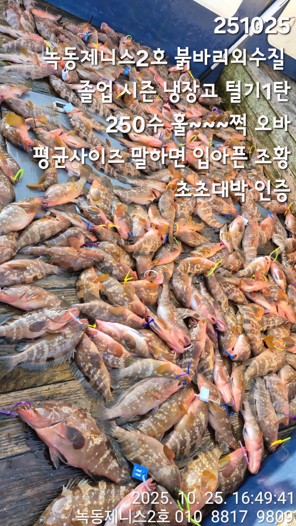 | 제목 : 251025 녹동제니스2호 붉바리외수질 졸업 시즌 냉장고 털기1탄 250수 훌~~~쩍 오바 평균사이즈 말하면 입아픈 조황 초초대박 인증 | ||
