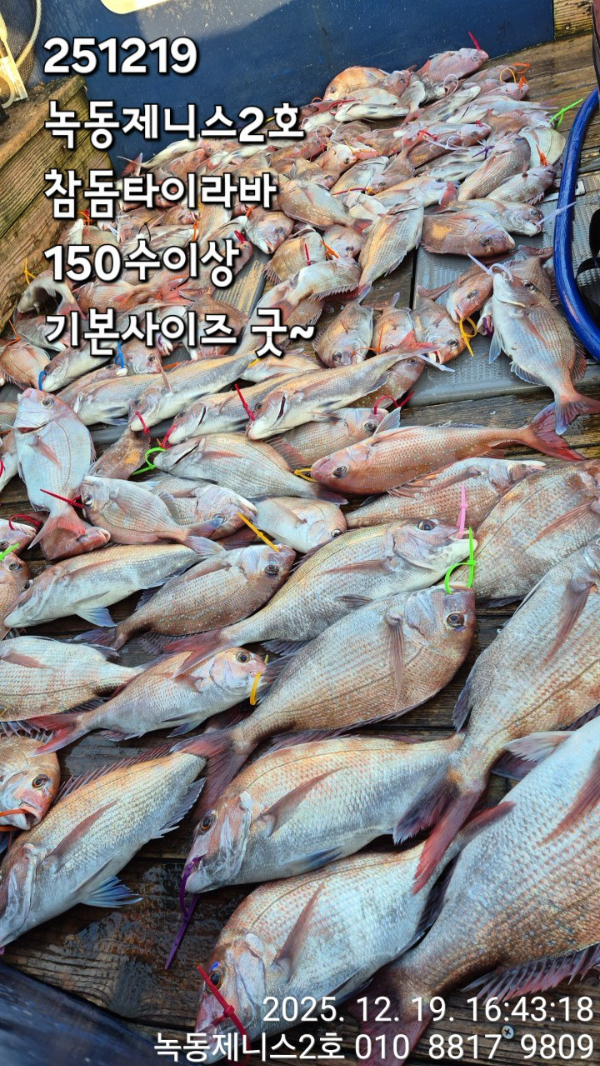 | 제목 : 251219 녹동제니스2호 참돔타이라바 150수이상 기본사이즈 굿~ | ||