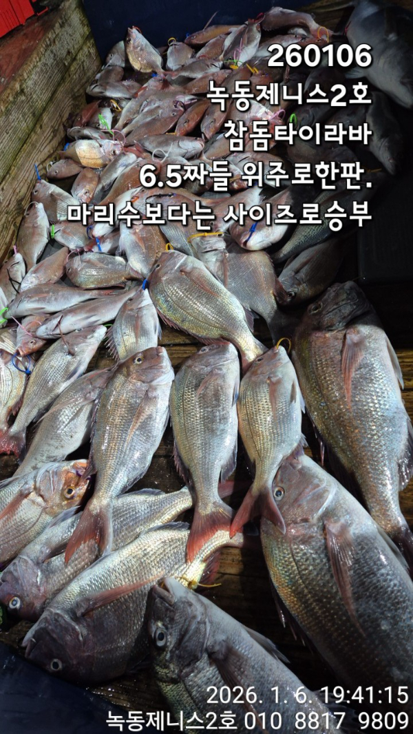 | 제목 : 260106 녹동제니스2호 참돔타이라바 6.5짜들 위주로한판. 마리수보다는 사이즈로승부 | ||