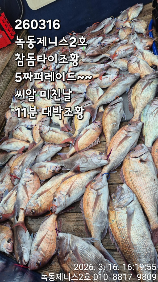 | 제목 : 260316 녹동제니스2호 참돔타이조황/ 내일예약중/ 5짜퍼레이드~~ 씨알 미친날 11분 대박조황 | ||